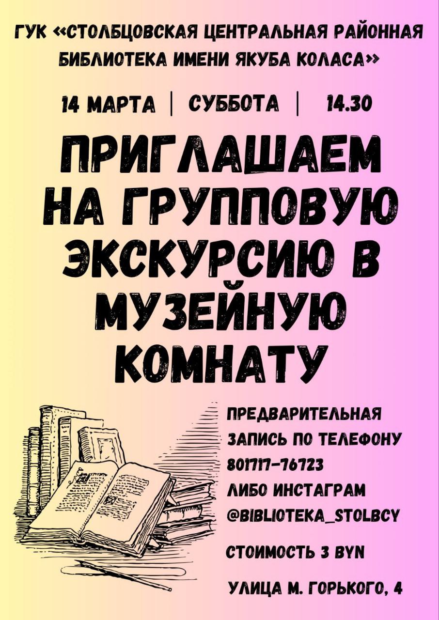 Начало в 14:30 Предварительная запись по тел.(801717)76723 либо в инстаграм @biblioteka_stolbcy